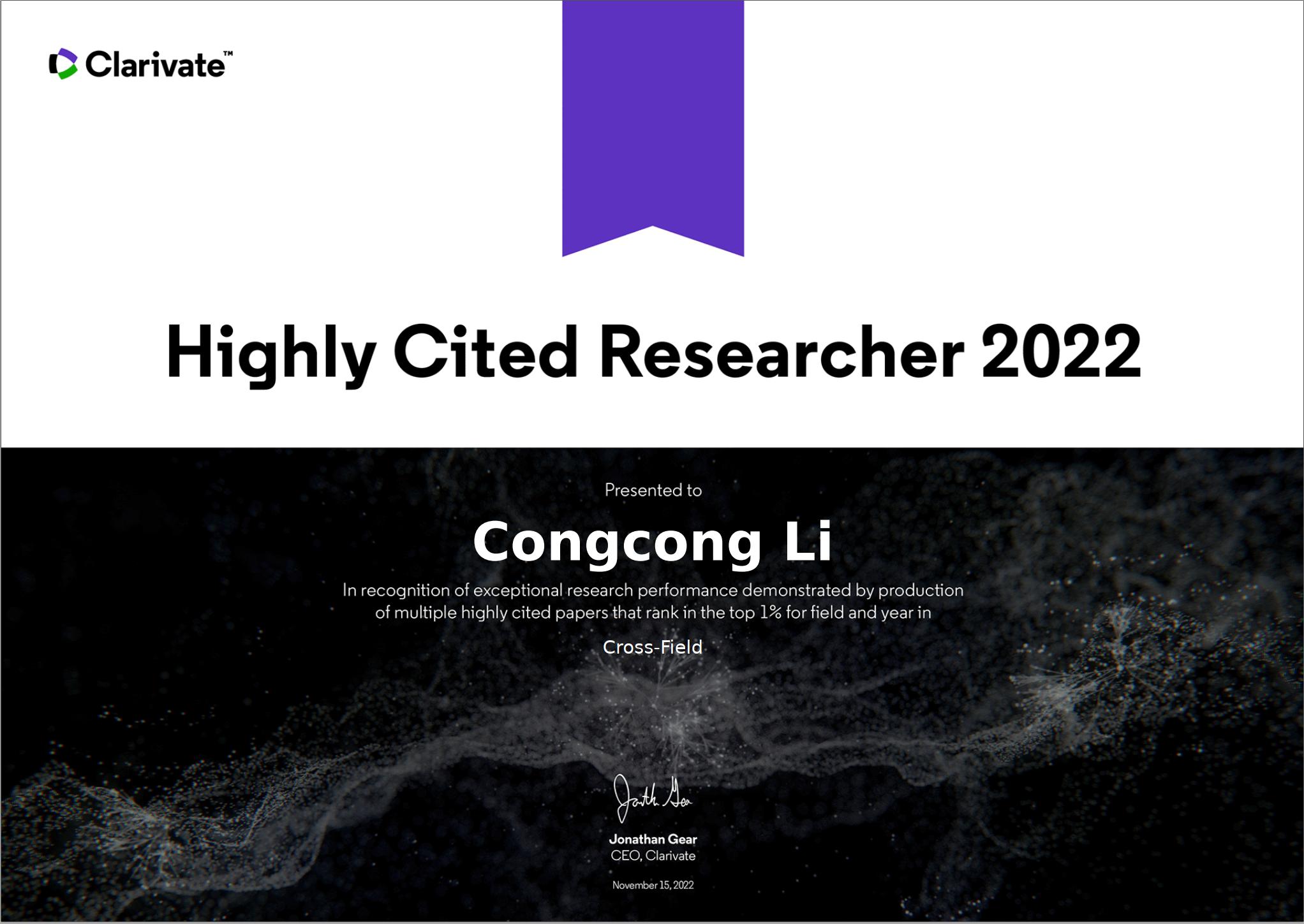 2022年11月15日,科睿唯安(Clarivate Analytics)发布了2022年度“高被引科学家” (Highly-Cited Researchers 2022)名单,来自全球69个国家和地区的6938人入选,其中中国内地的学者1169人。球王会体育信息系统与运营管理系李聪聪老师入选“跨学科领域”(Cross-Field)高被引科学家名单。这是球王会体育历史上第一位上榜的学者,实现了零的突破!