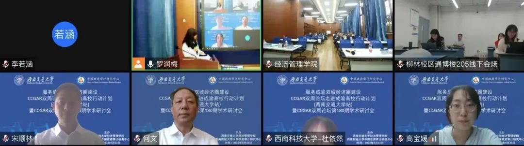2022年5月21日,中国政府审计研究中心"服务成渝双城经济圈建设,CCGAR双周论坛走进成渝高校行动计划(球王会体育站)"在球王会体育成功举办。康奈尔大学杨平教授、球王会体育李芾教授、中央财经大学宋顺林教授、中国中铁股份有限公司何文先生作了主题报告,球王会体育博士研究生肖琳分享了工作论文。球王会体育党委常委、副校长刘长军及球王会体育执行院长郭强致欢迎辞,郭强和中国政府审计研究中心主任蔡春教授分别作了论坛总结发言和答谢致辞。