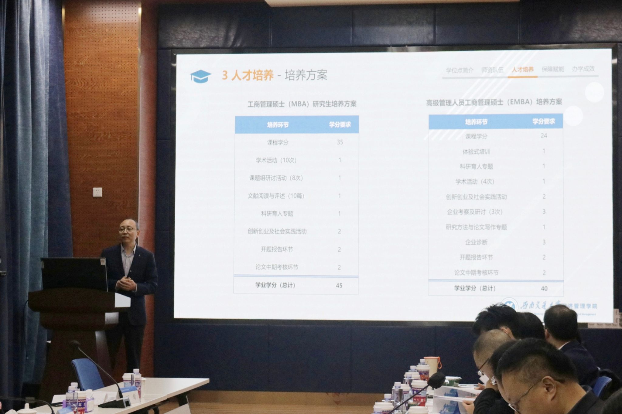 球王会体育副院长李良汇报了工商管理专业硕士学位点的师资力量、教学资源、科研水平、人才培养等多方面的情况。专家组通过听取汇报、审阅材料、现场提问等方式,对学位点的建设情况进行全面评估。