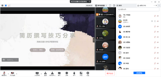 为了让同学们在实习、就业的过程中有更出彩的表现,球王会体育于2022年5月31日为2023届研究生开展简历培训和面试指导等相关工作。为配合防疫工作,本次培训线上举行,邀请了球王会体育学生工作组副组长贾佳和本科2021级辅导员、就业生涯导师张先凌为主讲人,2023届毕业生全部参与其中。