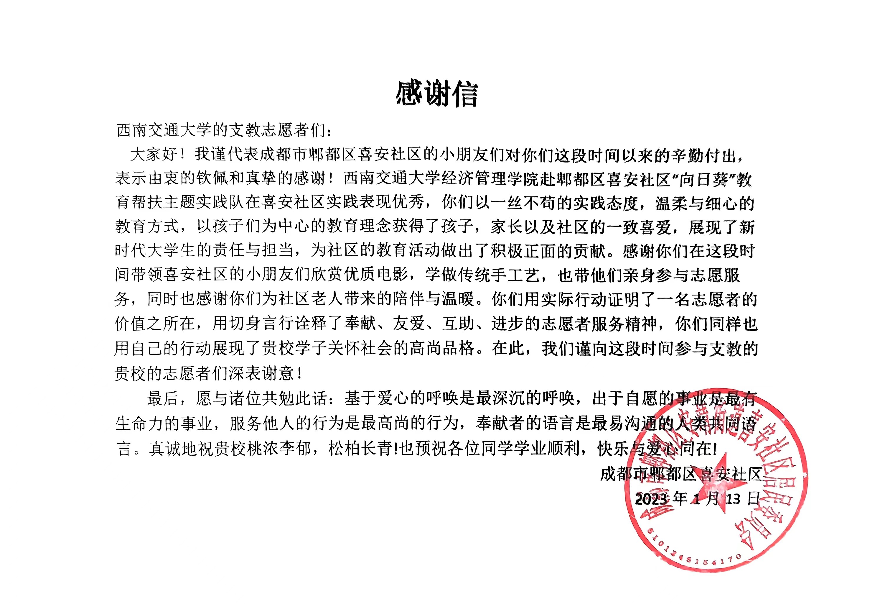 五天的实践活动在社区居民、小朋友和志愿者的欢声笑语中落下帷幕,通过本次活动,孩子们在众多特色课程中开拓了眼界,提升了动手能力,收获了一个充实的假期;志愿者在和小朋友的相处中获得了数不尽的快乐与感动,积累了志愿服务经验,提升了服务社会、回馈社会的能力。同时,志愿者们以青春之行助力基层教育帮扶,为基层的建设和发展倾注了青年力量,得到了当地社区群众的大力支持和一致好评。活动结束后,实践团队收到了来自喜安社区居委会的感谢信。