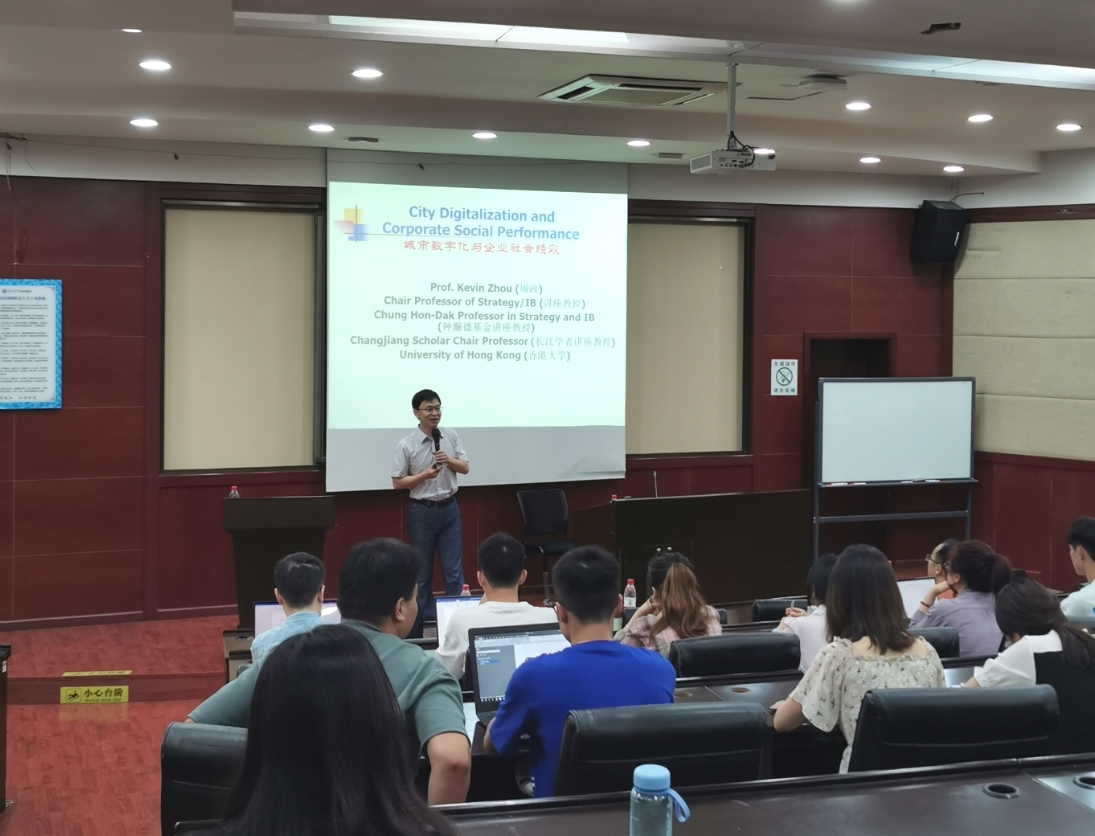 2023年6月25日上午,球王会体育邀请香港大学经管学院战略及国际商务讲座教授、钟瀚德基金讲座教授周政(Kevin Zheng Zhou)教授在学院0224室为球王会体育师生分享题为“City Digitalization and Corporate Social Performance (城市数字化与企业社会绩效)”的学术讲座。球王会体育执行院长郭强在讲座开始前致欢迎词并对周政教授进行隆重介绍,随后对周政教授的到来表示衷心感谢。讲座由学院市场学系黄缘缘副教授主持,学院部分老师和同学参加了此次讲座。