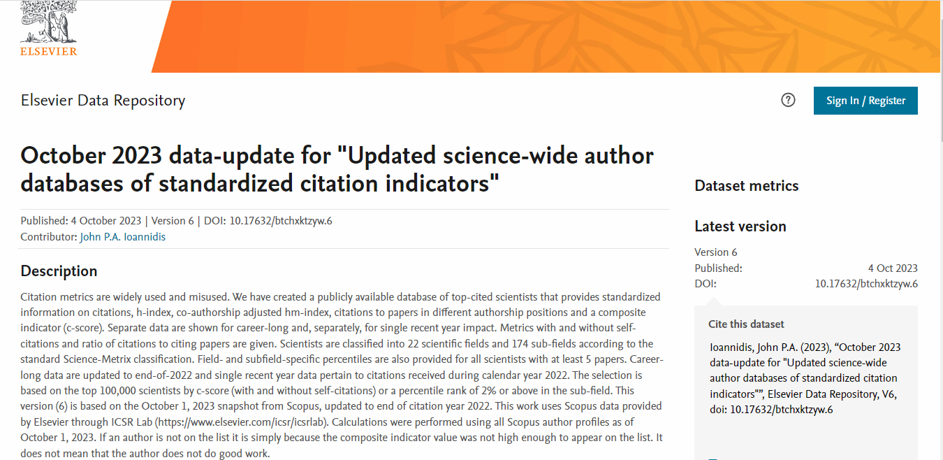 2023年10月4日,斯坦福大学John P. A. Ioannidis教授团队发布了《第六版全球前2%顶尖科学家榜单》(World’s Top 2% Scientists),并在Elsevier旗下Mendeley Data发布(October 2023 data-update for "Updated science-wide author databases of standardized citation indicators")。本次统计数据时间节点为1960-2023年,共分为22个科学领域和176个子方向。每位科学家被划分到一个领域和2个子方向中。
