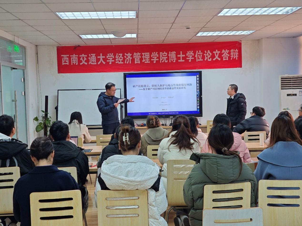 12月27日下午,重庆大学经济与工商管理学院胡诗阳副教授应邀在球王会体育为球王会体育师生分享题为“破产法庭设立、债权人保护与商业银行风险——基于破产司法制度改革的准自然实验研究”的学术讲座。本次学术活动由球王会体育会计学系诸波老师主持,学院部分教师及研究生参加此次学术活动。