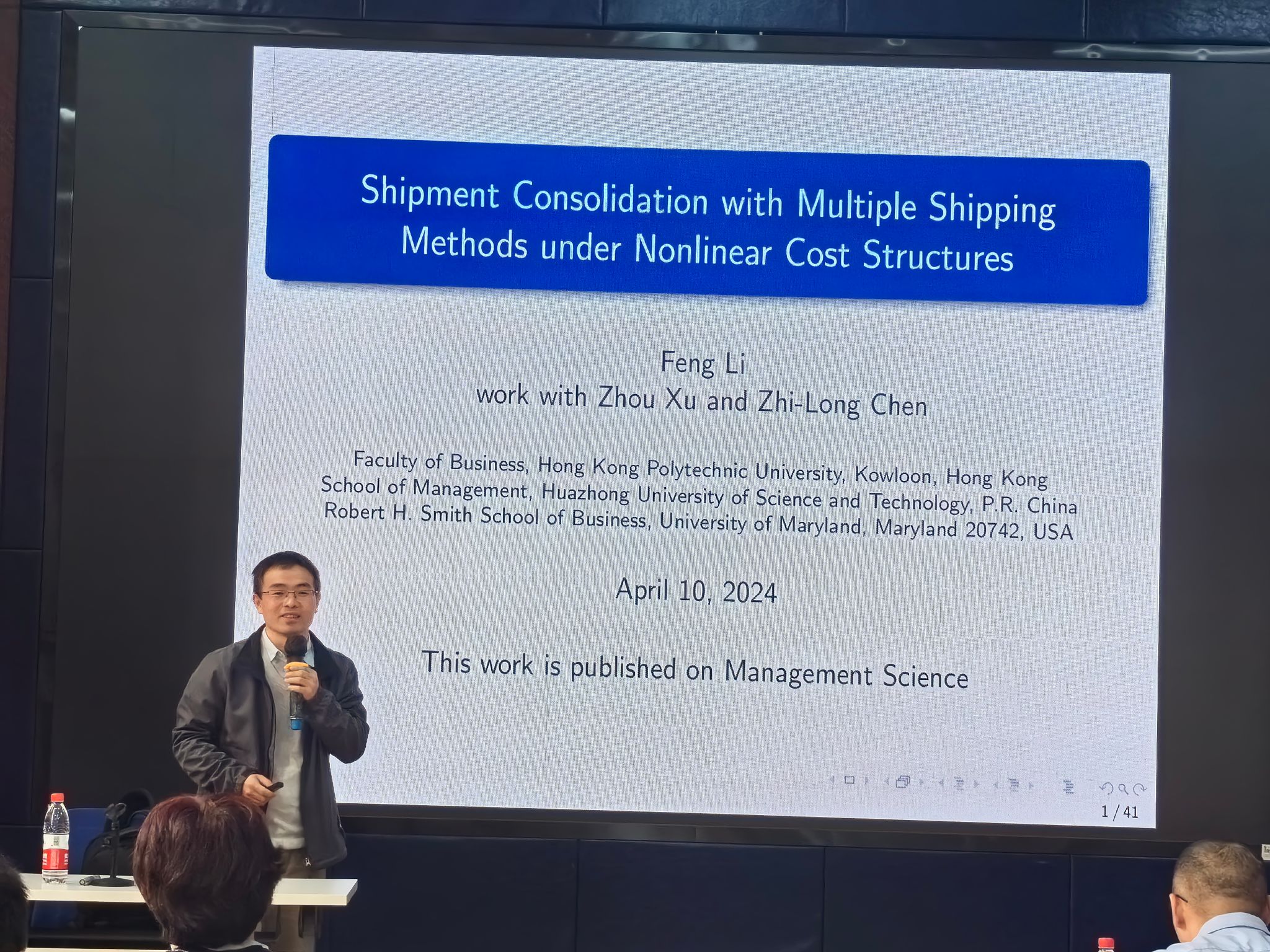 本次讲座专注于“基于非线性费用函数下多运输模式的订单匹配问题”的这一研究的分享。李锋教授首先以宝武钢铁和良品铺子这两个企业的货物运输模式,引出了本文研究的主题——多运输模式下的订单匹配问题。同时还介绍了中国邮政速递和联邦快递两个企业的运输收费模式——增量折扣和总量折扣,借此引出了本研究的另一主题——非线性运输费用。最后介绍了文章的创新点,只关注与装运合并相关的决策、运输方式和运输成本等的定义更一般化和研究更理论化。