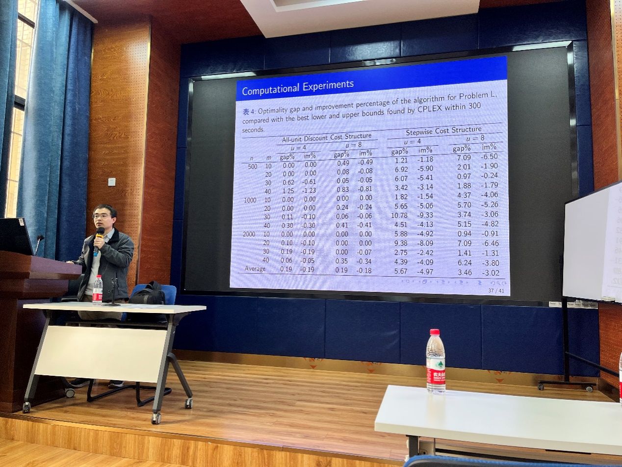2024年4月10日,华中科技大学李锋教授应邀在球王会体育为学院报师生分享题为“基于非线性费用函数下多运输模式的订单匹配问题”的学术讲座。本次学术活动由学院副院长聂佳佳教授主持,学院部分教师及研究生参加了此次学术活动。
