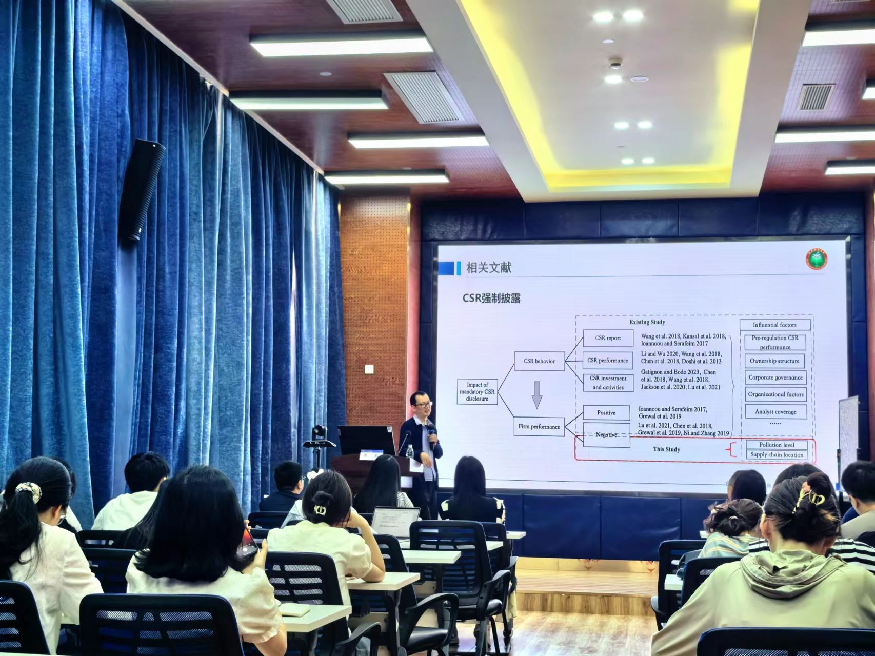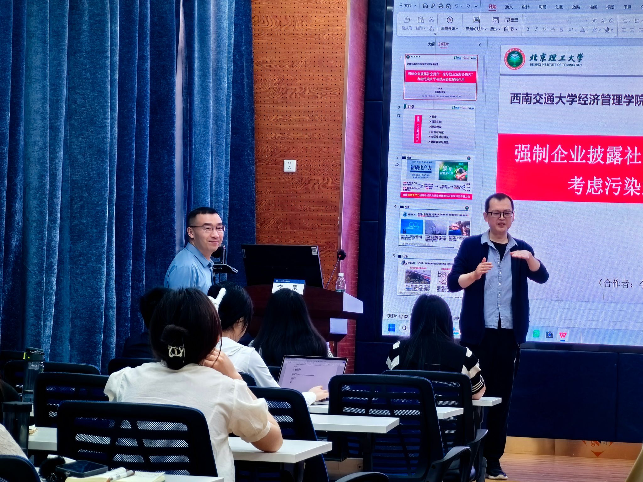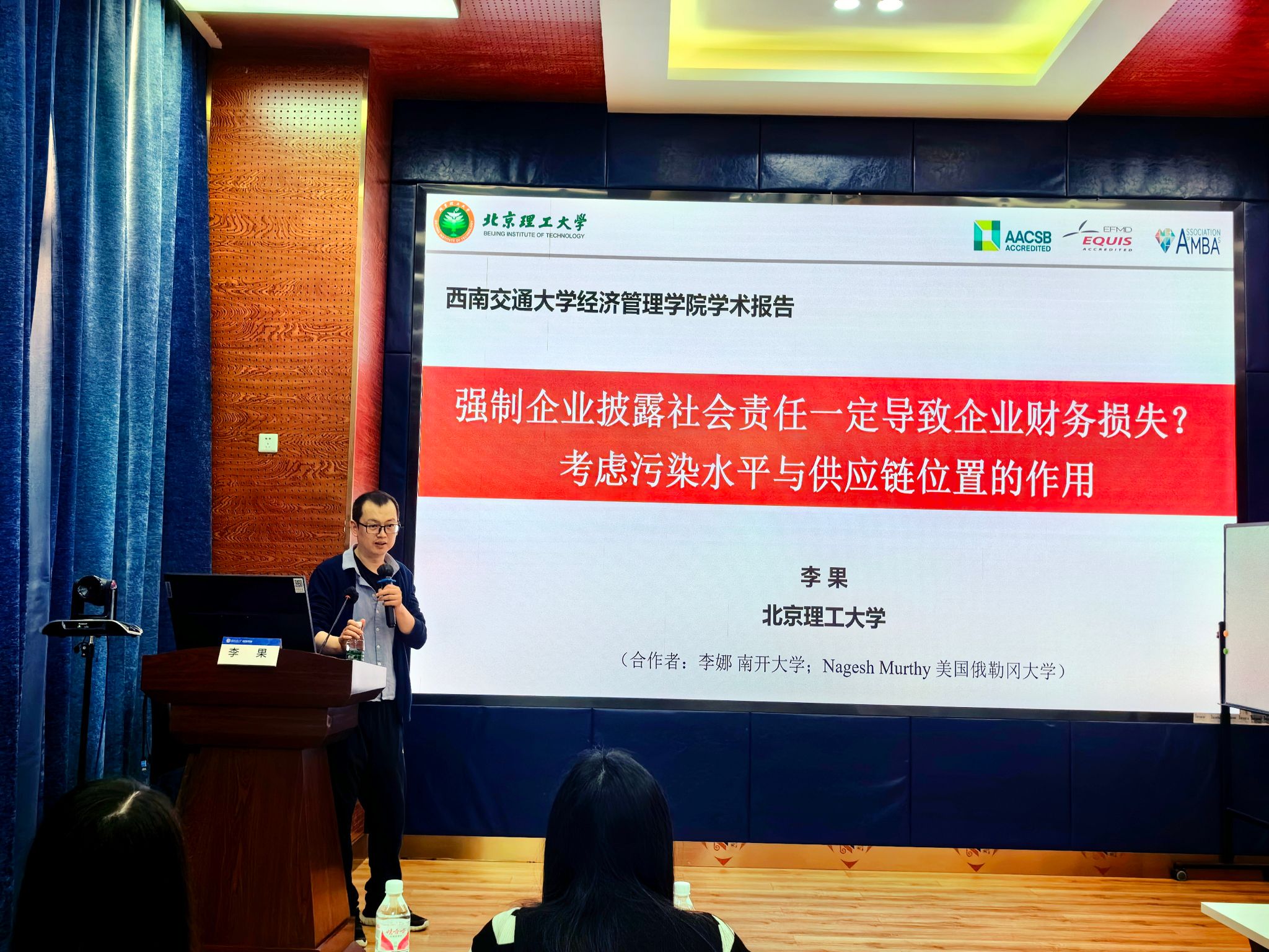 2024年5月24日,北京理工大学管理与经济学院管理科学与物流系主任,国家高层次人才计划入选者李果教授应学院邀请,来球王会体育展开学术交流活动,交流主题为“强制企业披露社会责任一定导致企业财务损失?考虑污染水平与供应链位置的作用”。本次学术活动由学院副院长聂佳佳教授主持,学院部分教师、博士生和硕士生等50多人参加了此次学术活动。聂佳佳教授首先对李果教授的学术成果进行了介绍,同时对李果教授的来访表示热烈的欢迎!