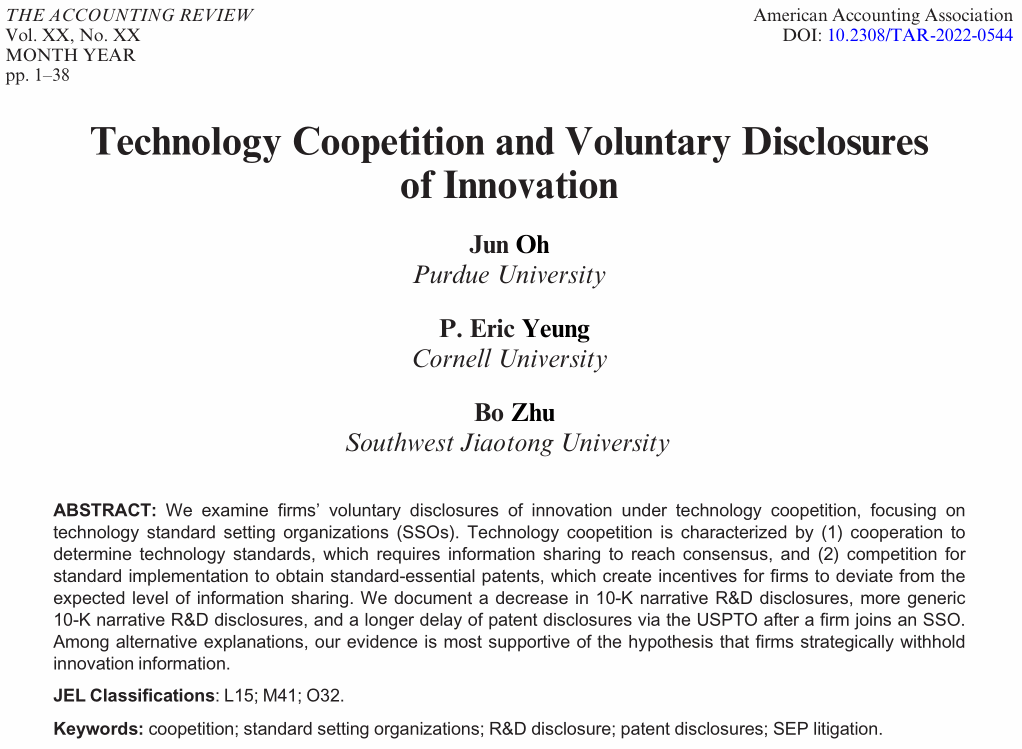 球王会体育会计学系副教授诸波于2024年8月在UTD 24期刊The Accounting Review在线公开发表题为Technology Coopetition and Voluntary Disclosures of Innovation的论文。该论文以技术标准制定机构(SSO)为研究对象,考察了企业在技术竞合下创新的资源披露情况。技术竞合的特点是:(1)合作制定技术标准,这要求企业信息共享以达成共识;(2)竞争标准执行以获得标准必要专利,这会激励企业偏离预期的信息共享水平。研究发现,在企业加入SSO后,减少了10-K文件中的叙事性研发披露、10-K文件中披露更通用的叙事性研发信息,更长地延迟通过美国专利商标局进行专利披露。论文的实证证据支持企业策略性地隐瞒创新信息披露的假设。