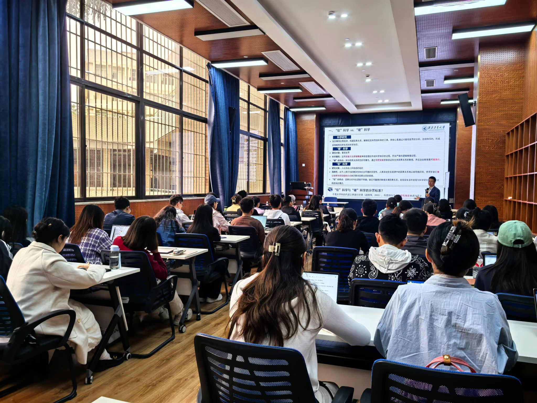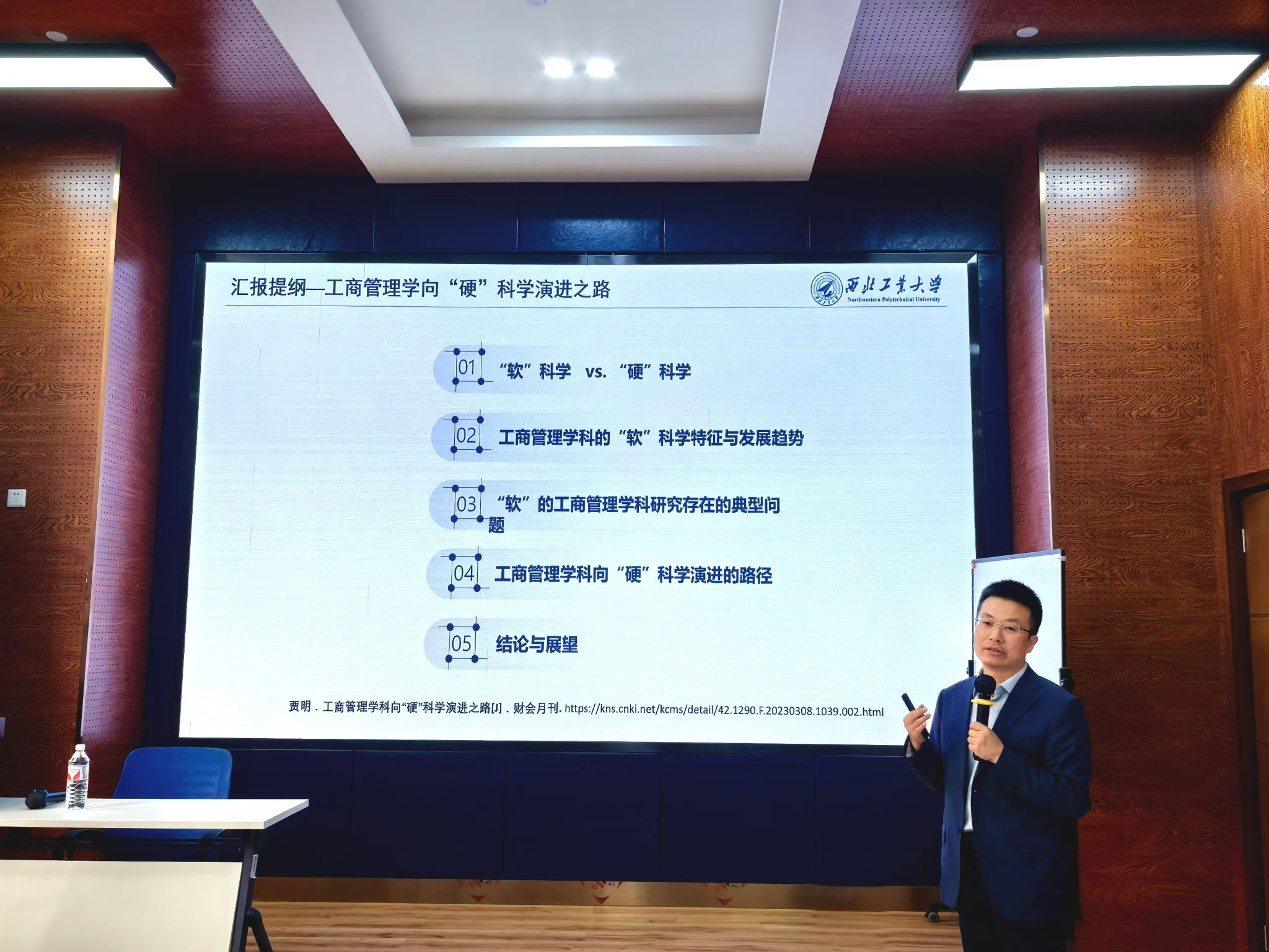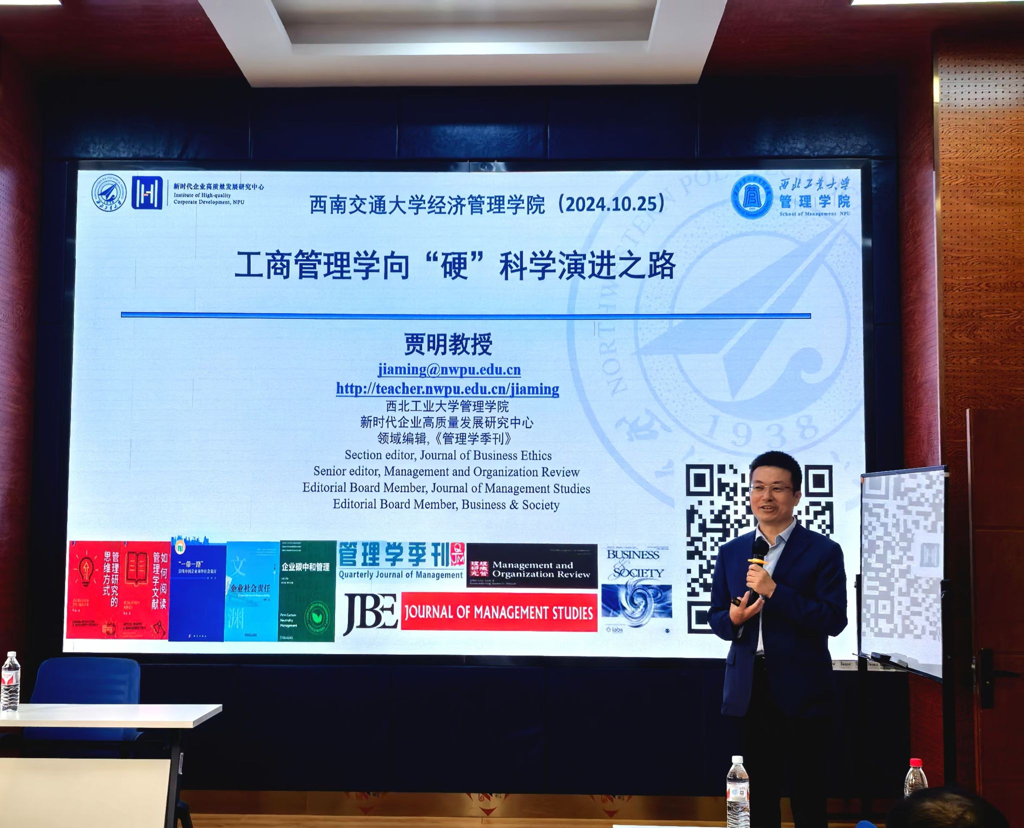 2024年10月25日下午,西北工业大学管理学院贾明教授应邀在九里校区球王会体育为球王会体育师生带来了一场聚焦于“工商管理向硬科学演进之路”的学术讲座。本次学术活动由副院长马锋主持,学院部分教师及研究生60余人参加此次活动,副院长马锋介绍贾明教授的学术背景与成就,并代表学院对贾明教授表示欢迎与诚挚的感谢。