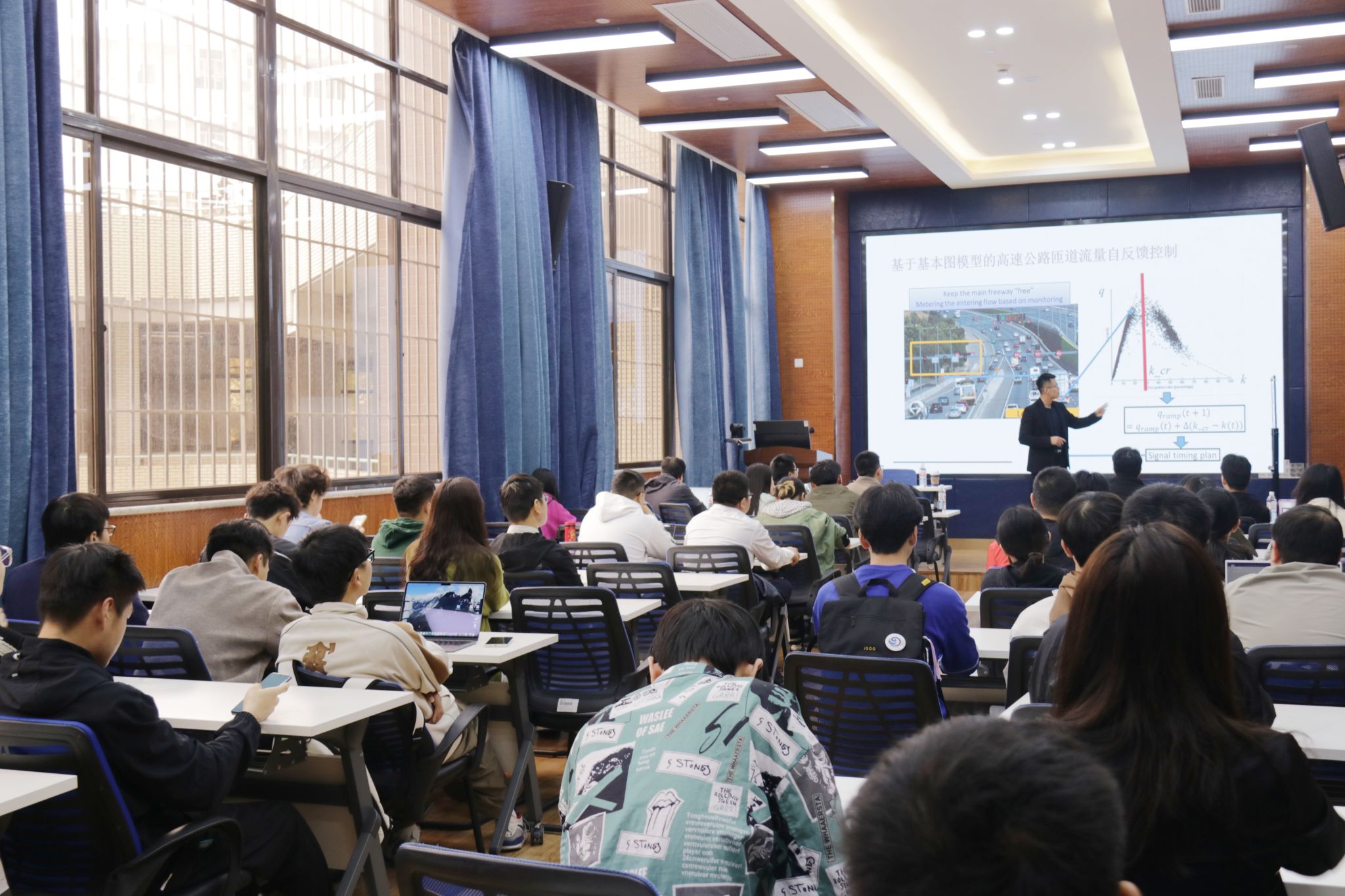 2024年11月1日上午,特邀国际知名的交通流研究专家、莫纳什大学副教授郑楠应邀在球王会体育为师生带来了一场主题为“网络级交通流建模与控制-宏观基本图模型特性与相关研究进展”的校外学者系列讲座。本次学术活动由球王会体育院长韩科主持,球王会体育及交通运输与物流学院相关专家、老师、研究生共80余人参与此次学术交流活动。学院院长韩科对郑楠副教授的学术背景与成就进行了介绍,并代表学院对郑楠副教授表示欢迎与诚挚的感谢。