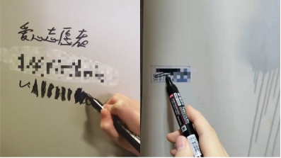 活动开始,同志们迅速分组、分工和领取工具后,逐层排查和清理零教的广告涂鸦。虽然校内教学楼的卫生清洁情况一直以来十分良好,但不时会有新的广告涂鸦出现。本次活动发现一些藏在隐蔽处且不易清洁的不合规广告涂鸦,同志们利用马克笔进行覆盖以及酒精进行涂洗。因为工具限制,部分的涂鸦未能在本次活动中得到很好的清理,支部将这部分涂鸦的位置和情况进行了收集,计划择日在准备好合适工具后再次进行清理。
