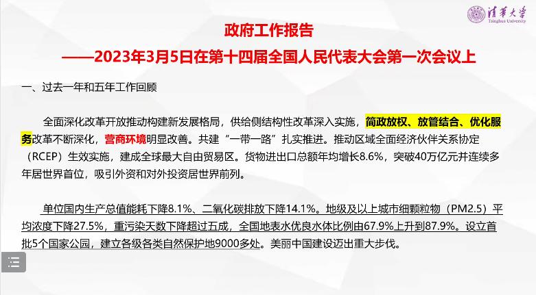 第一部分,赵彦健老师从过去一年和五年的工作回顾、对2023年政府工作的建议、2023年经济社会发展工作重点三个方面对政府工作报告进行解读。结合具体的经济指标,诸如国内生产总值、城镇新增就业、居民消费价格、货物进出口总额等,赵老师谈到在过去五年,在中国共产党的坚强领导下,我们在攻坚克难中稳住了经济大盘,在复杂多变的国内外环境取得傲人成绩。展望未来,我们将完整、准确、全面贯彻新发展理念,走好高质量发展之路。