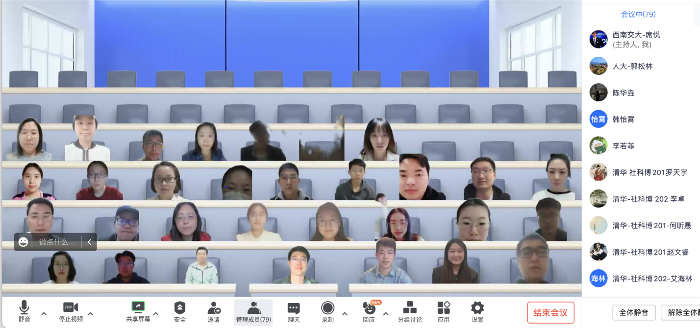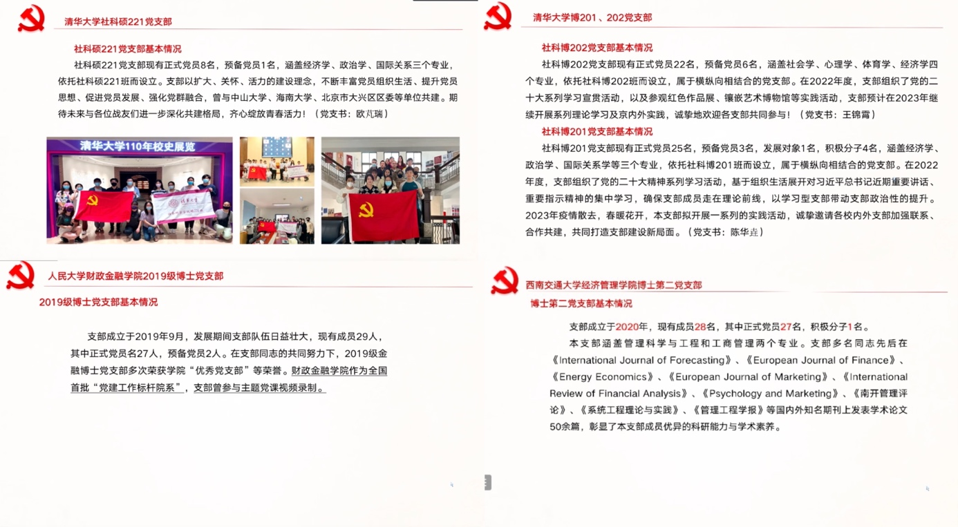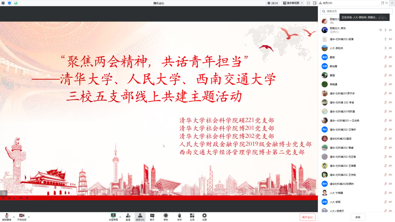 东风浩荡,奋进新程;凝心聚力,奋楫扬帆。为响应全党关于学习“两会”精神的号召,深化支部间联合共建,2023年4月11日晚7点30分,球王会体育博士第二党支部联合清华大学社科硕221党支部、社科博201党支部、社科博202党支部、中国人民大学财政金融学院2019级金融博士党支部,以线上腾讯会议形式召开“聚焦两会精神内涵,共话青年担当”为主题的支部共建学习活动。此次会议由球王会体育博士第二党支部书记席悦同志主持,球王会体育、清华大学和人民大学的五个党支部近百余名党员同志参加了此次活动。